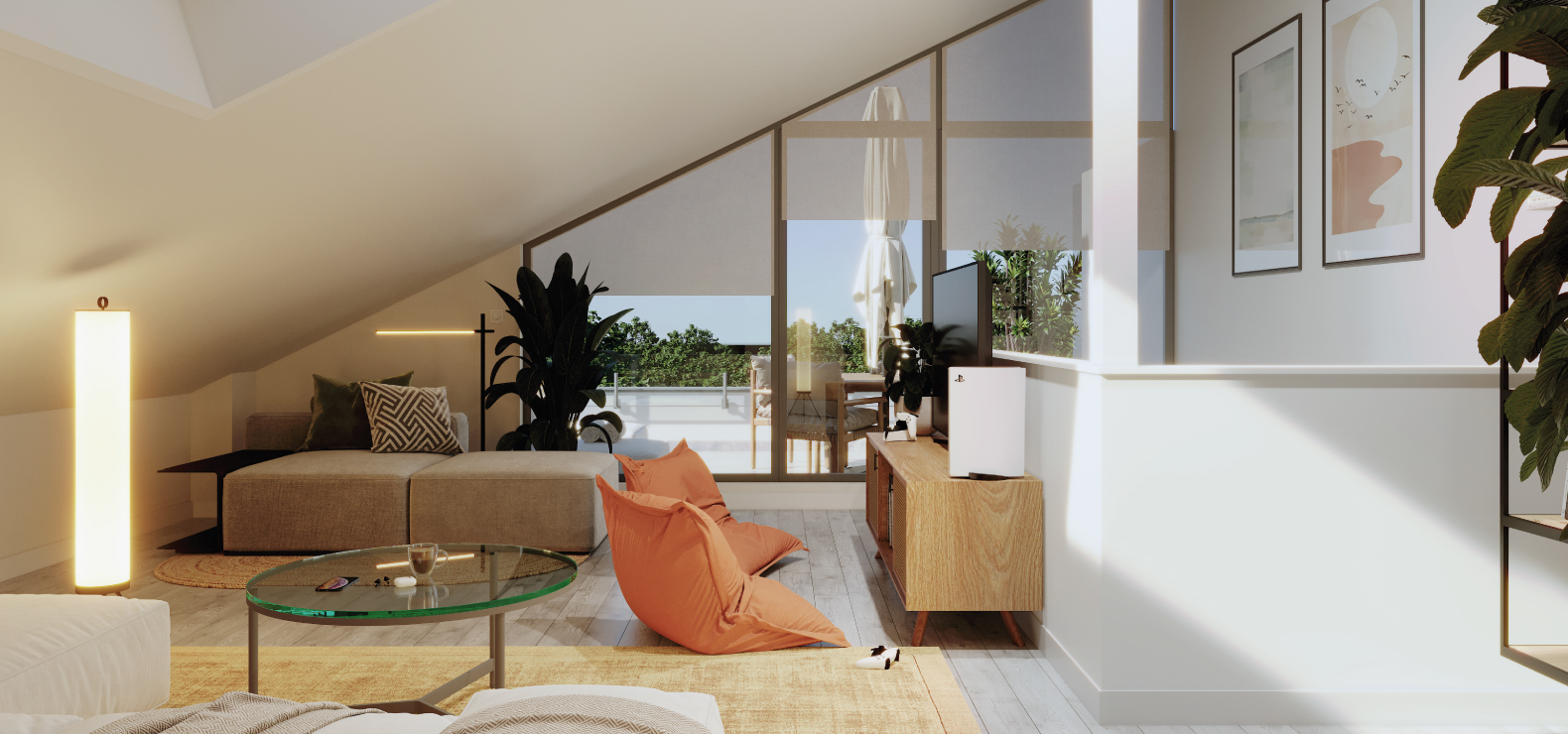 Viviendas con certificación energética A, donde la iluminación natural invade la planta bajocubierta y desciende al resto de la casa por la escalera central. La sala en la bajocubierta, con paredes acristaladas, se adapta a tus necesidades, ya sea como sala de juegos, despacho o espacio de estar.